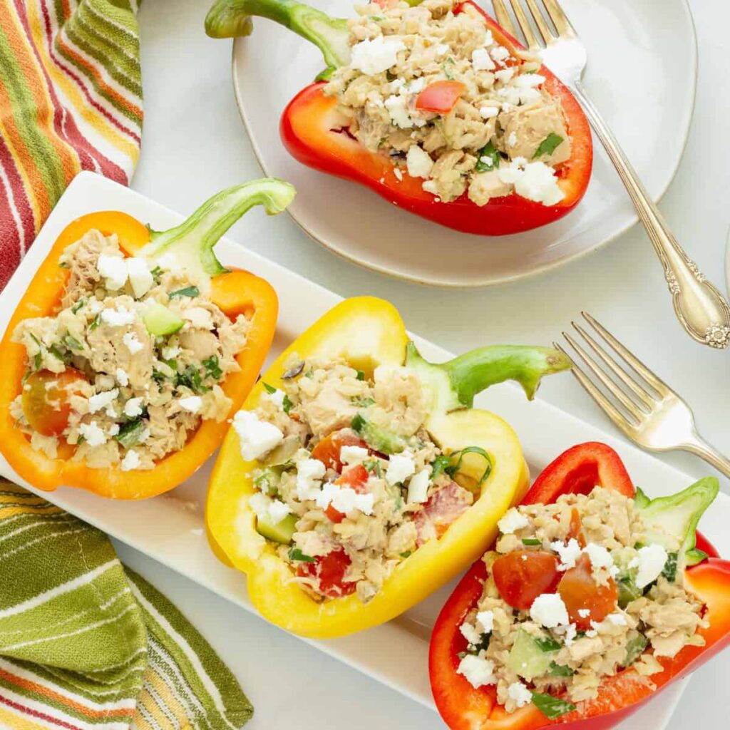 These tuna-stuffed peppers bring together sweet bell peppers, tender brown rice, and creamy hummus for a satisfying dish that doesn’t rely on mayonnaise.