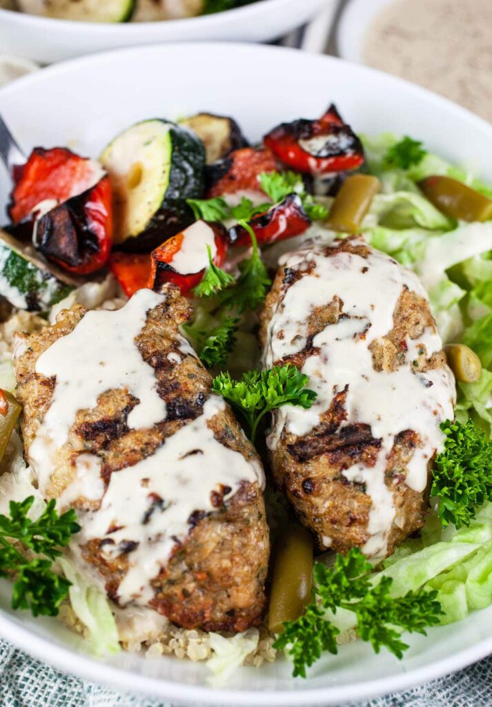 This Chicken Kofta Kebab recipe combines ground chicken, fresh herbs like parsley and mint, warm spices such as cumin and coriander, and a creamy tahini sauce.