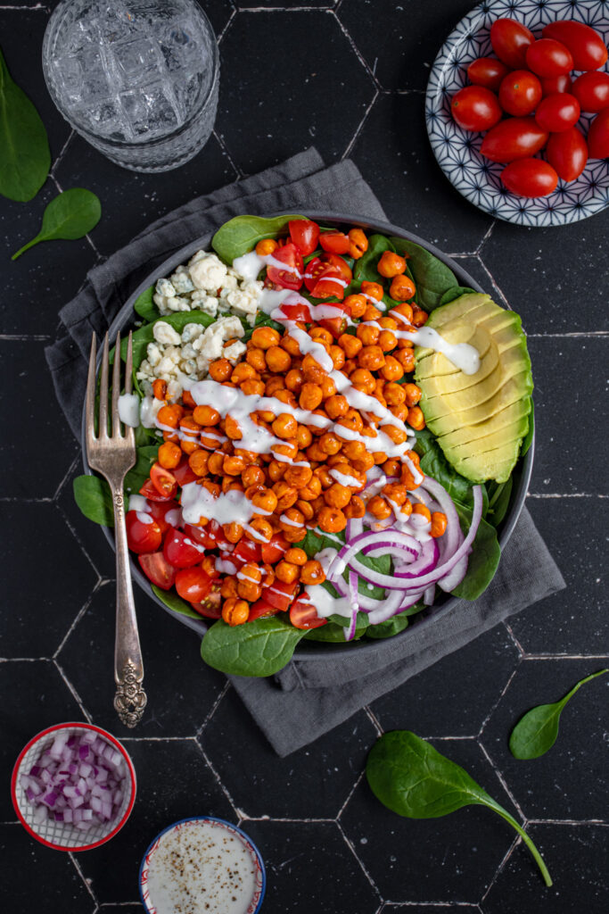 This salad features roasted chickpeas tossed in bold buffalo sauce, paired with fresh greens and creamy dressing.