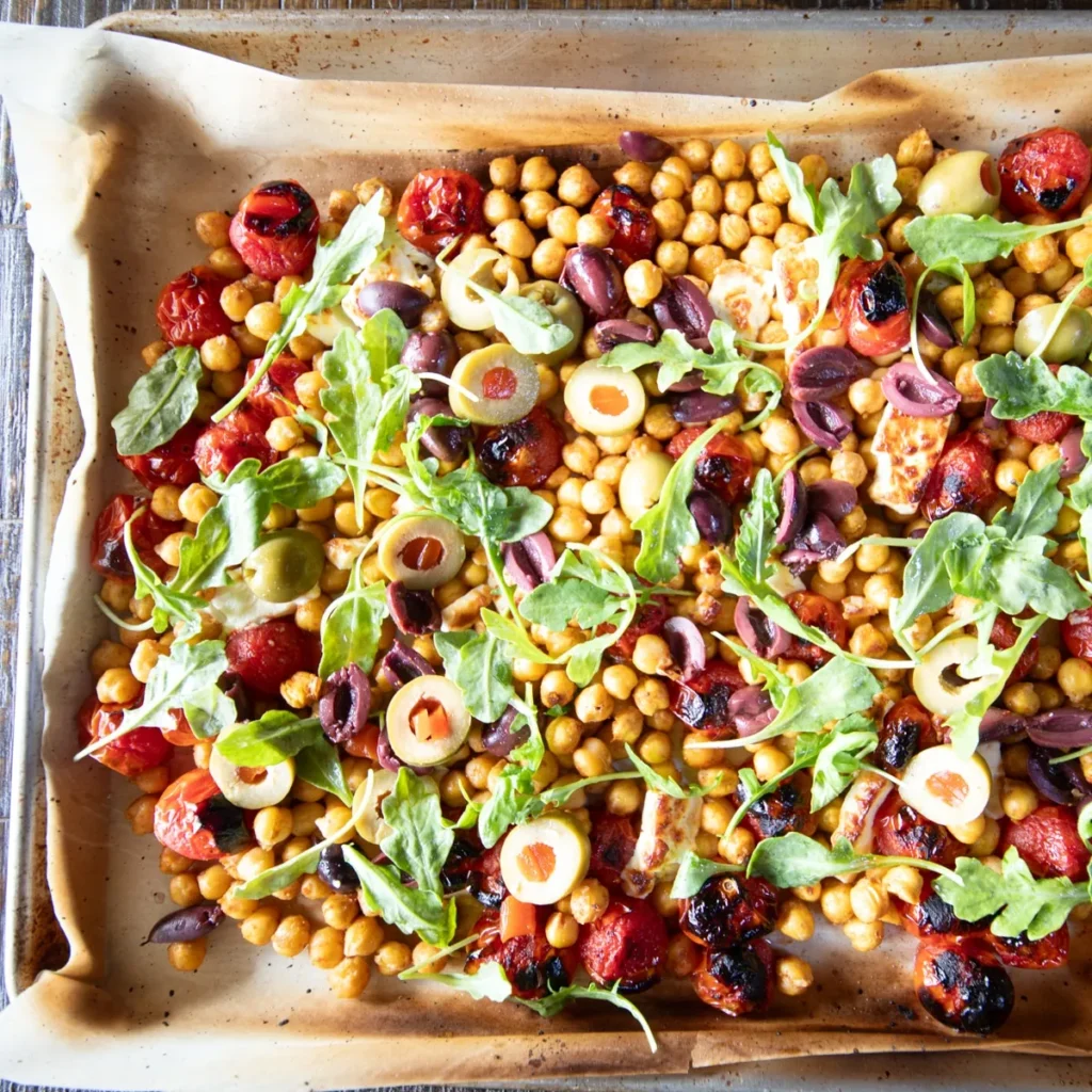This warm salad features roasted chickpeas paired with tangy feta and smoky fire-roasted tomatoes, creating a bold and hearty dish.