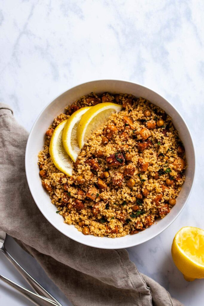 Fluffy couscous is paired with roasted chickpeas, dried fruit, and warm Moroccan spices for a flavorful and aromatic dish.