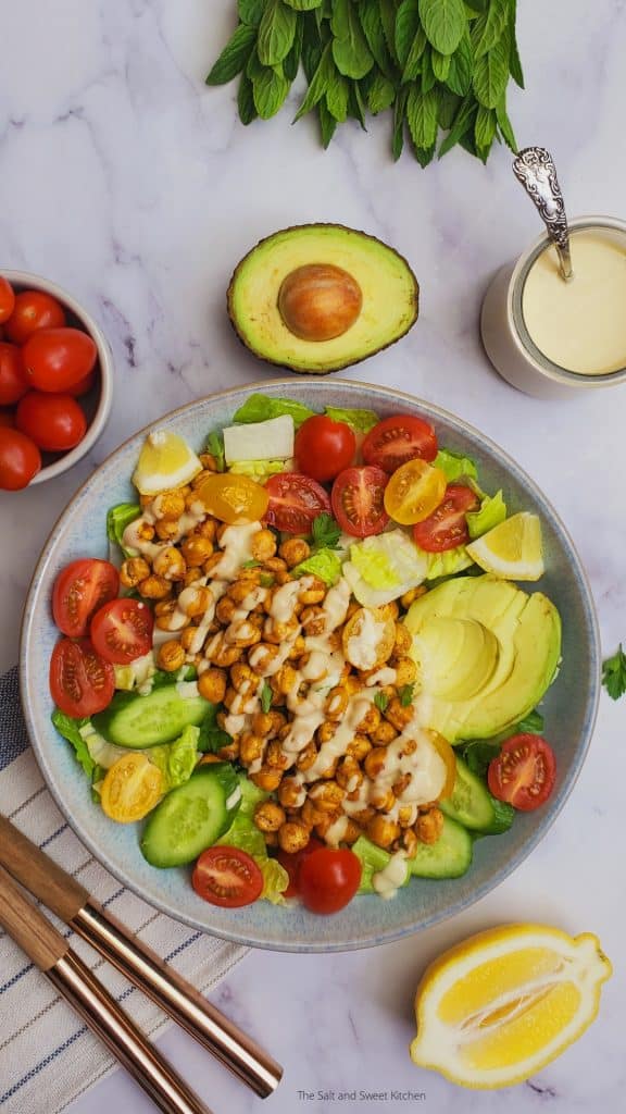This vegan version swaps out traditional croutons for spiced chickpeas and is drizzled with a simple, creamy dressing, creating a deliciously satisfying twist on the classic.