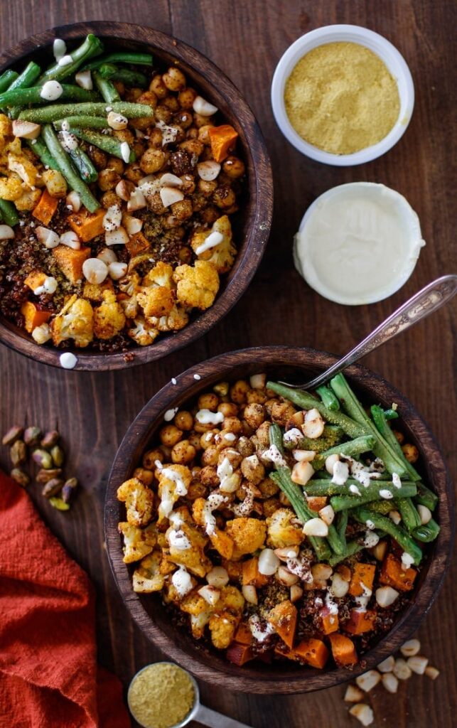 Loaded with roasted vegetables, crispy chickpeas, and fluffy quinoa, this Buddha bowl offers a hearty and nutritious option.