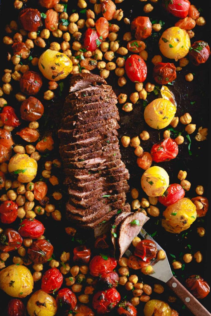 Roasted chickpeas are paired with seasoned lamb, vegetables, and Mediterranean spices, all cooked on a single sheet pan for a flavorful and convenient meal.