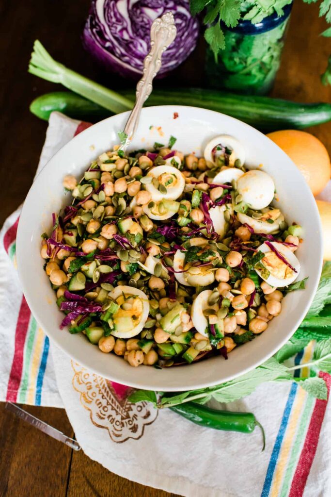 Packed with crisp cucumbers, crunchy cabbage, zesty red onions, fresh cilantro, and mint, plus a kick of citrus-marinated chickpeas and protein-rich eggs, it’s a colorful and bold addition to any meal.