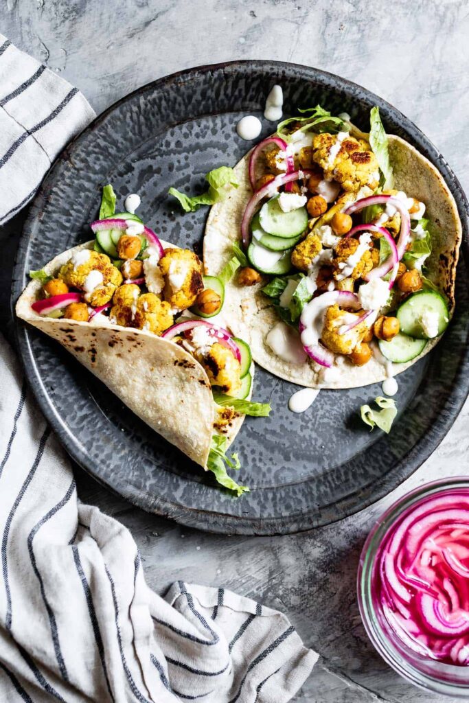 These simple vegetarian shawarma tacos are packed with roasted chickpeas and cauliflower, quick-pickled onions, and a creamy yogurt tahini sauce!